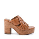 An intricate design of woven leather gives a bohemian vibe to these chunky heeled mules. The lightweight unit platform construction has been treated with a wood like finish, giving it the sensibility of a clog, while an open toe and crisscrossing upper keeps these slide sandals airy and easy.